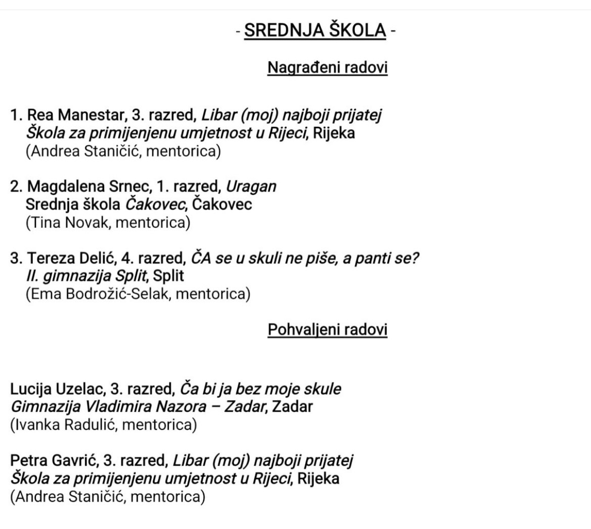 S velikim zadovoljstvom objavljujemo da je naša učenica Tereza Delić (4.a) nastavila dugogodišnji niz uspjeha učenika II. gimnazije Split sudjelovanjem na XI. međunarodnom literarnom, recitatorskom i likovnom natječaju „ČA u versin, riči i pinelu“.